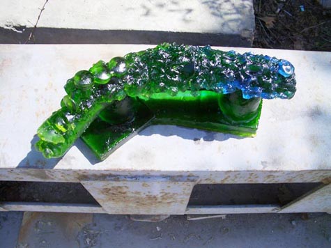 It is painstaking detail work and must be done carefully because glass is very fragile. My model had many undercuts. Eventually I found that a brush used to clean dishes with water, along with some thin but strong wire for the very hard to get to places, which seemed to work the best. Li Gang and his assistant invited me to join them for a lunch made at his studio of Chinese noodles, with a soy and lamb paste, along with some tomatoes and eggs. I then went back to work on the glass castings. I began to tire, started to make mistakes and was getting cut in the process. So I took a nap.